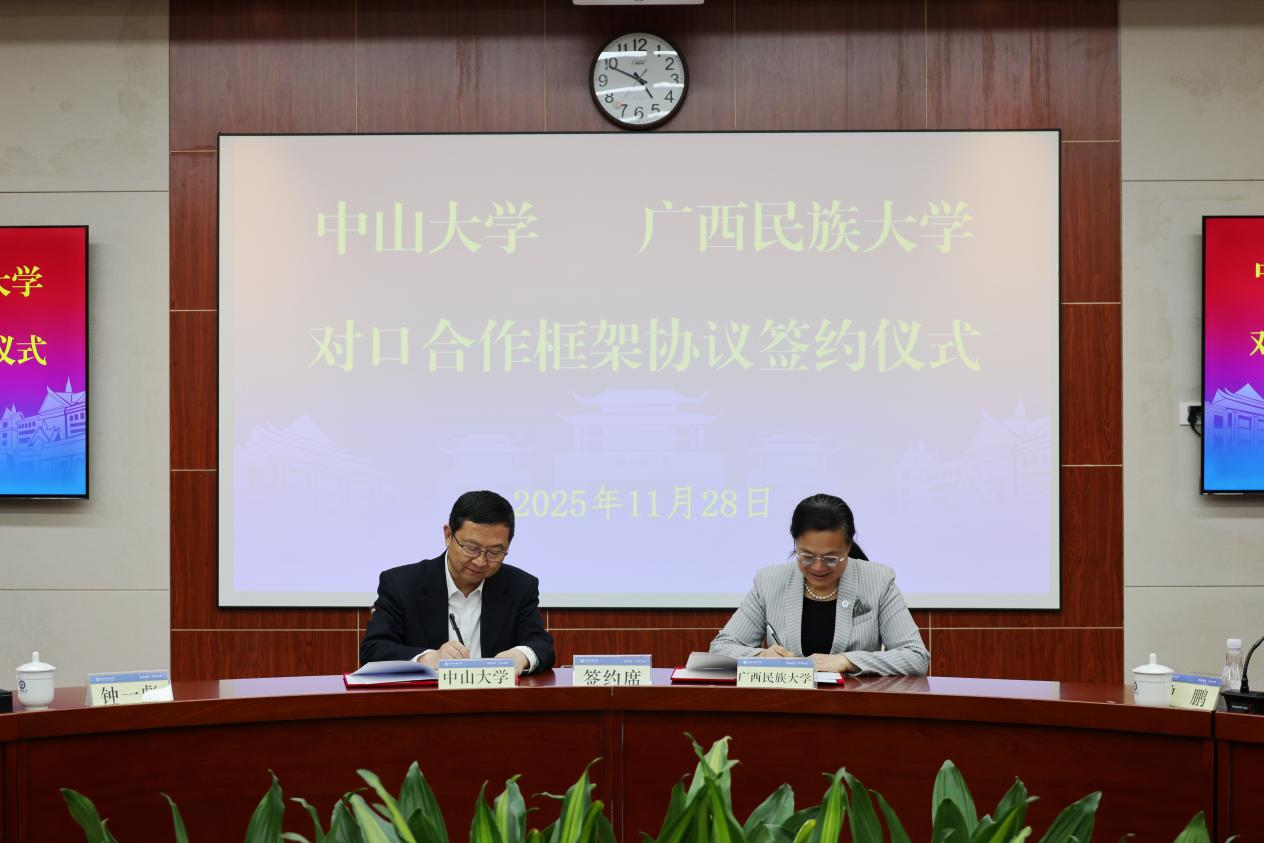 2025年11月28日,中山大学与广西民族大学签署对口合作框架协议。摄影:党委宣传部 邱清萌