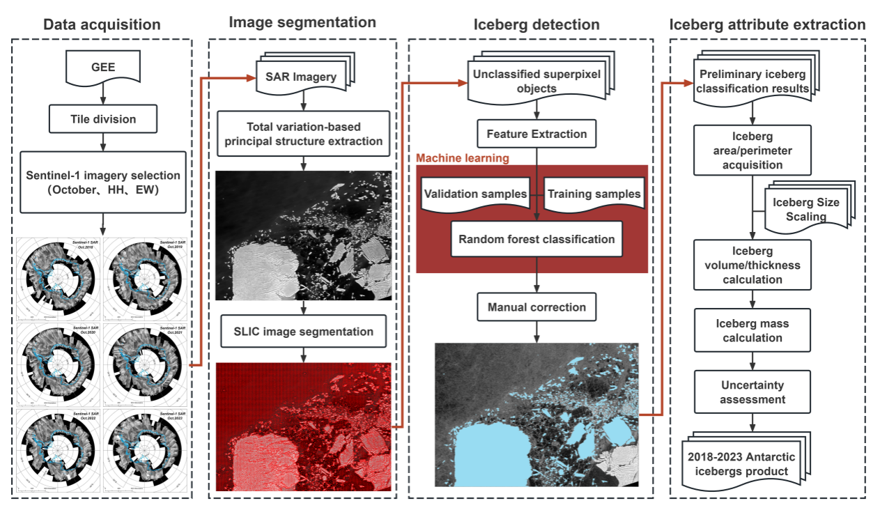 文章的通讯作者李腾副教授详细阐述了这次南极冰山“建档”的技术路线:“我们基于Google Earth Engine平台获取Sentinel-1 SAR镶嵌影像,覆盖南纬55°以南的南大洋海域。研究采用增量随机森林分类与人工校正相结合的半自动方法,提取了面积大于0.04平方公里的冰山,构建了2018-2023年每年10月的冰山分布数据集。”这个数据集给每座冰山建立了“身份档案”,记录了冰山的地理坐标及几何属性(面积、周长、长轴和短轴),并给出了面积不确定性估计。在固定密度假设下,结合冰山尺寸-质量关系估算了冰山质量及其不确定性范围,最终构建了一个环南极冰山综合数据集。