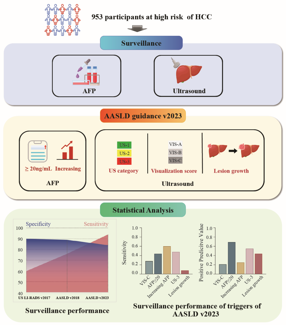 研究连续纳入肝癌高危人群,比较了AASLD v2023与既往指南的监测效能,结果显示新版指南显著提高HCC监测灵敏度,尤其降低了超声可视化受限人群的漏诊风险;虽特异度略降,但仍处于合理范围,且假阳性具有可识别特征,便于后续分层管理。