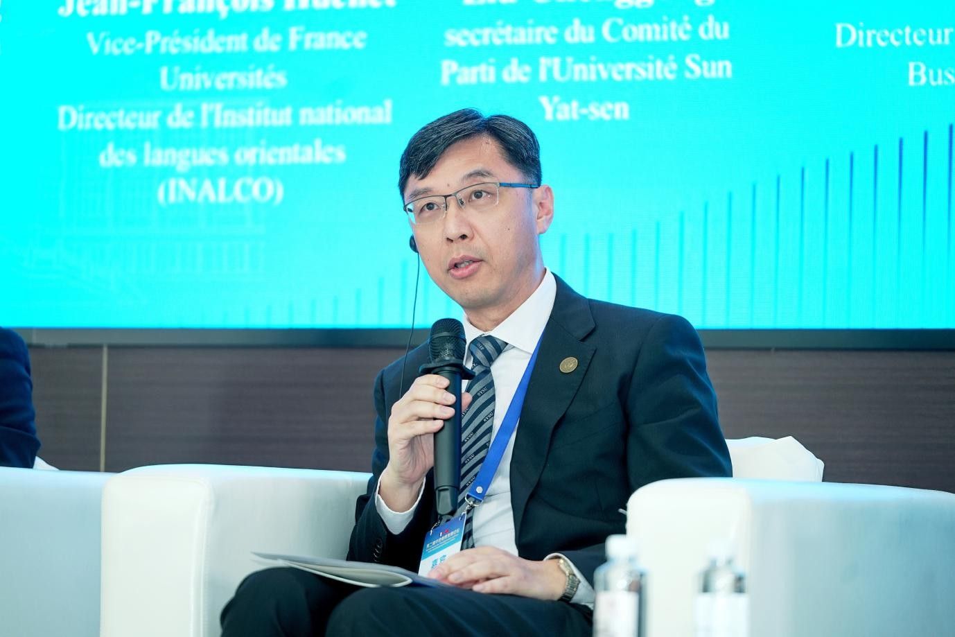在“应对全球重大挑战的人文社科创新路径”分论坛上,刘承功书记与来自其他五所中法高校代表共话经验与见解。刘承功表示,中山大学长期以来深耕中法教育与科研合作,在法语教学推广、法国文化研究以及中西方学术交流方面积累了丰硕成果与宝贵经验。围绕以人文社科创新共同探寻应对全球重大挑战,刘承功提出,一要构建开放生态,夯实合作根基;二要推动跨学科协同,革新研究范式;三要坚持价值引领,推动文明交流互鉴。他强调,中山大学将继续与法国高校及研究机构携手,为促进文化交流和文明互鉴、共同应对全球重大挑战积极贡献智慧和力量。