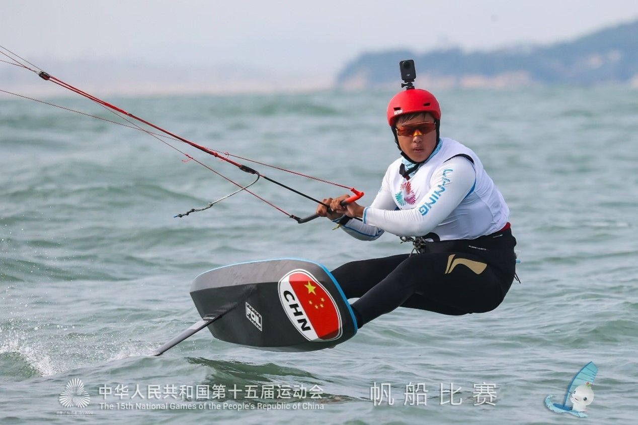 决赛期间,海面风势变幻莫测,全面考验选手的综合能力。黄齐滨双手稳健操控风筝缆绳,水翼板托举着他在海面上御风疾驰。面对每一次风力的波动与转向,他都能迅速调整身体姿态与板体角度,最大化利用风能。这种对风、水、板、人四位一体的出色掌控,成为他取胜的关键。最终,他将这枚宝贵的金牌收入囊中。