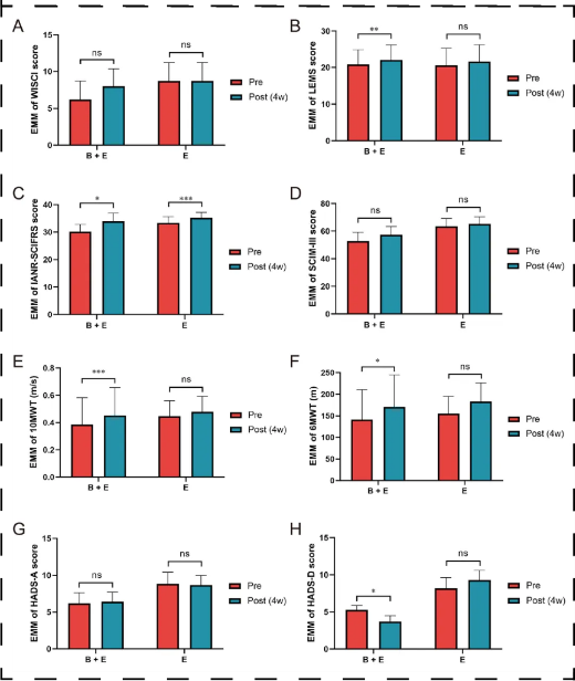在为期4周的干预后,脑控外骨骼训练组(B+E组)在下肢肌力(LEMS)、步行速度(10MWT)、步行耐力(6MWT)及抑郁评分(HADS-D)等关键功能指标上均显著优于仅接受外骨骼训练(E组)的疗效(图2)。