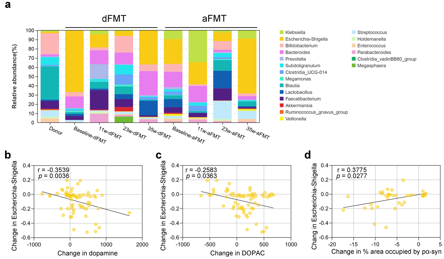 采用国际通用便秘评分量表(CSS)评估,dFMT组患者评分平均下降6.5分,远超对照组。运动功能的改善与下消化道症状的缓解存在关联,为“肠-脑轴”的双向互动提供关键的临床证据。治疗后患者肠道菌群结构向健康供体方向发生转变,与PD肠道炎症密切相关的Escherichia-Shigella菌属丰度降低。这一关键菌群变化与患者结肠活检组织中磷酸化α-syn病理聚集的减少呈显著正相关。