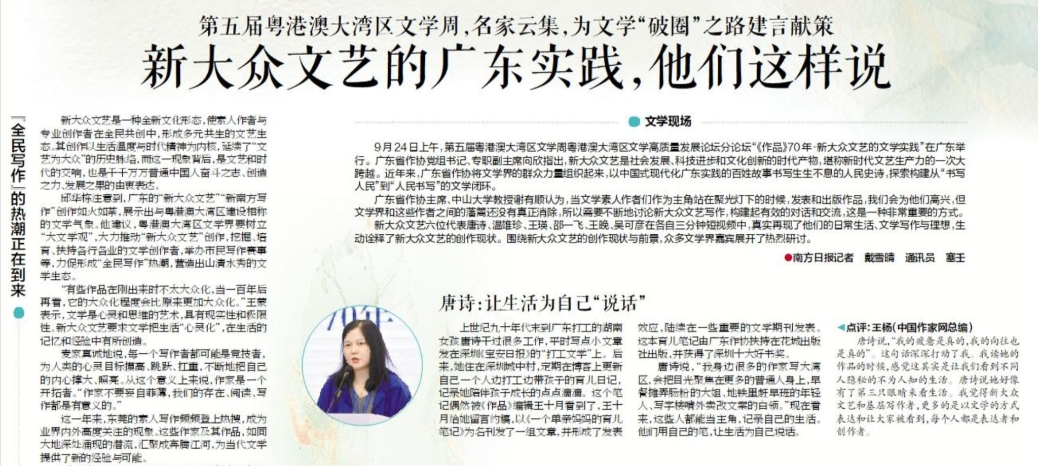 9月24日上午,第五届粤港澳大湾区文学周粤港澳大湾区文学高质量发展论坛分论坛“《作品》70年·新大众文艺的文学实践”在广东举行。广东省作协党组书记、专职副主席向欣指出,新大众文艺是社会发展、科技进步和文化创新的时代产物,堪称新时代文艺生产力的一次大跨越。近年来,广东省作协将文学界的群众力量组织起来,以...