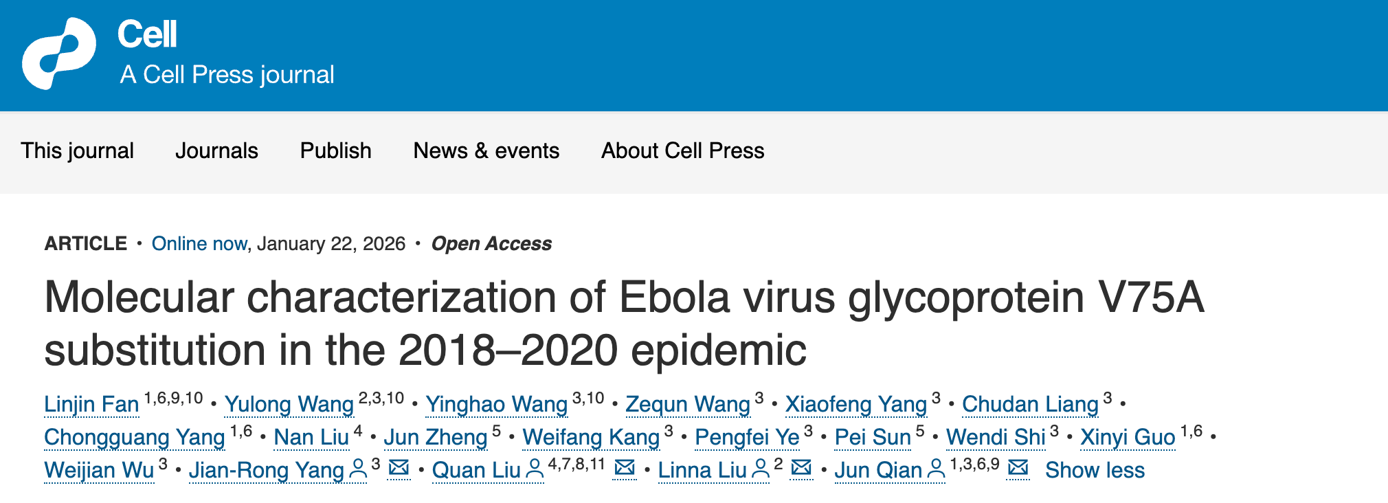 A collaborative study led by Sun Yat-sen University (SYSU) has systematically identified a critical "advantageous" mutation in the Ebola virus (EBOV) that emerged during the devastating 2018–2020 epidemic. The findings, published on January 23 in the prestigious journal Cell, offer vital scientific clues for understanding viral evolution and developing broad-spectrum antiviral strategies.