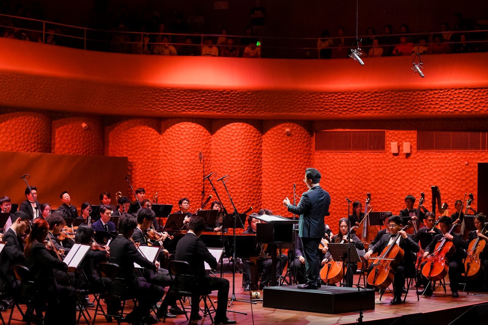 Associate Professor Huan Meng conducting the Shenzhen Campus performance